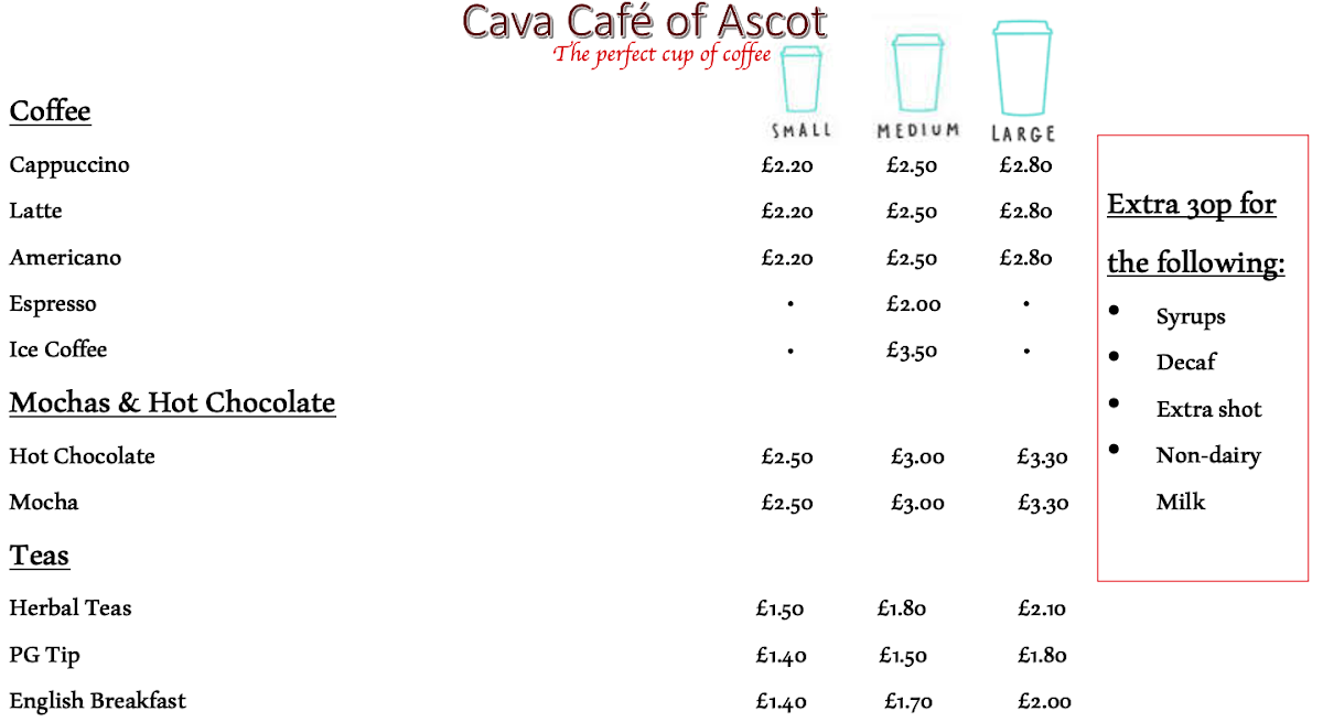 For those with a sweet tooth, indulge in a rich Mocha or cozy up with a luxurious Hot Chocolate, providing just the right touch of comfort, especially on chilly mornings. And for tea lovers, Cava Cafe offers a selection of herbal teas, PG Tips, and classic English Breakfast teas—ideal for anyone wanting a traditional, warming experience.